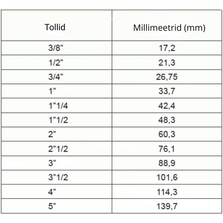 Vaata tabelist tollmõõtude vasted millimeetrites: